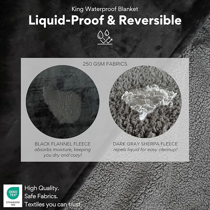 - King size blanket with ultimate moisture barrier. Waterproof bed cover shields the surface beneath from spills, leaks, and accidents—whether on your bed, couch, or favorite cozy spot. Say goodbye to wet spots and hello to dry, dependable comfort.