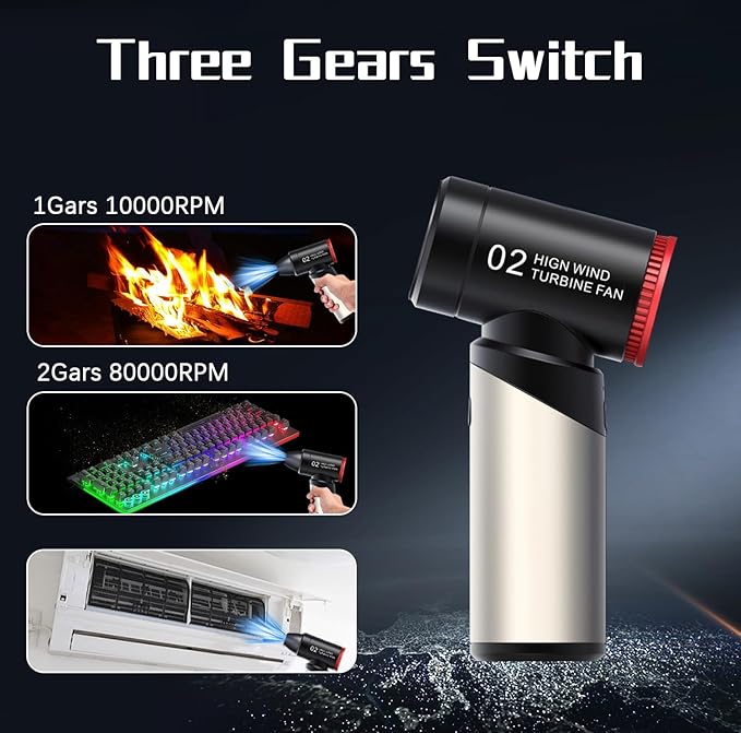 - 【High-Speed Compressed air Duster】This compressed air duster features a high-speed brushless motor with a maximum RPM of 110,000,delivering a top wind speed of 45m/s and a powerful wind force of up to 5OZ.Its strong and high performance effortlessly deals with surface dust,rain,and snow.