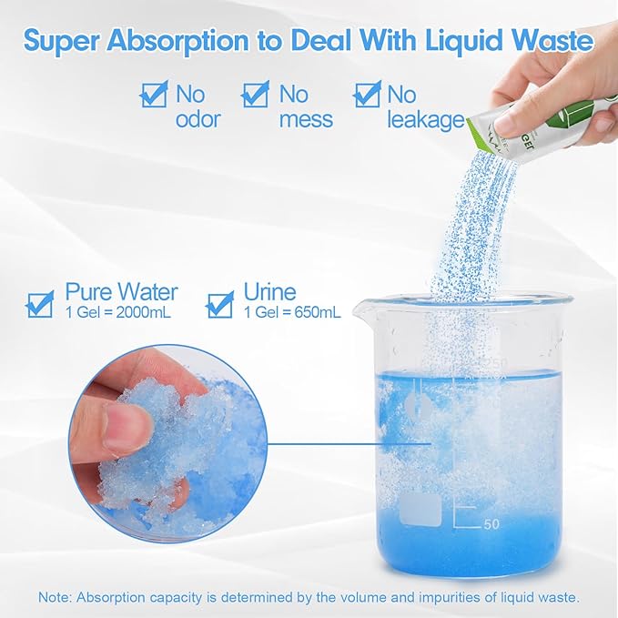 - 🏕️【Easy to Use】You can pour the Poo Absorbent powder into a portable toilet bag, then put in the waste liquid (You can also put in the waste liquid first) and wait about 1 minute for the waste liquid to solidify quickly. Wait about 1 minute for the waste liquid to solidify quickly. Dispose of it properly after the crystals have solidified.Every 10g of waste liquid gel treats 2000ml of pure water or 650ml of urine.