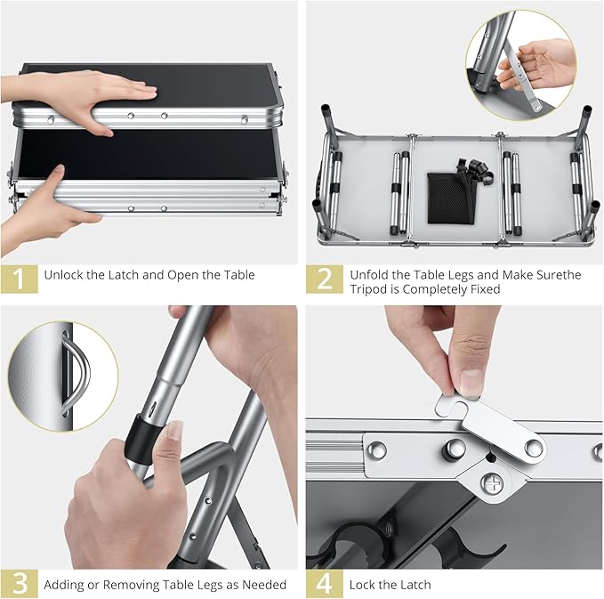 - Portable & Easy to Install and Fold up: This 3ft folding table comes with carry handles and a storage bag, making it very portable. Set up within 1 minute and folds up into a briefcase sized package for easy transport and space-saving, great to store in your car, RV, river rafts, motorcycle rear seats