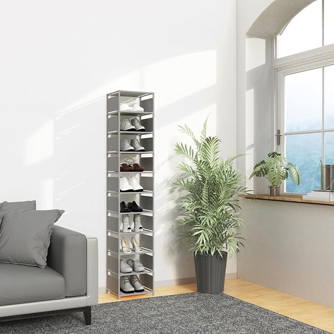 Vertical Shoe Rack, 10 Tier Grey Narrow Shoe Organizer for Closet Entryway, Tall Slim Shoe Tower for Small Spaces, Space Saving Corner Shoe Shelf