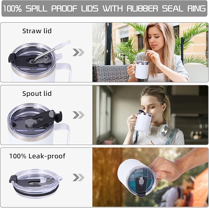 Volhoply 12oz Insulated Leakproof Coffee Mug with Flip & Straw Lid Bulk 2 Pack,Double Wall Vacuum Stainless Steel Travel Tumbler Cup with Handle,Reusable Camping Mugs Keep Cold/Hot(White,2 Set)