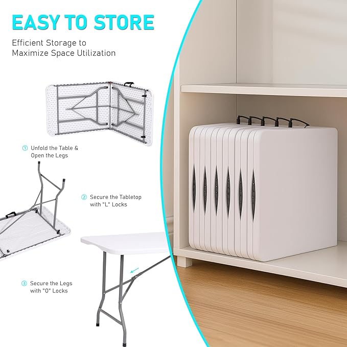 - Foldable and Portable Design: The ONUUNPY 6-foot plastic folding table can be conveniently folded in half and secured with a safety buckle. It features a comfortable handle for easy carrying, making it ideal for storing in your car trunk and perfect for picnics and outings with friends.