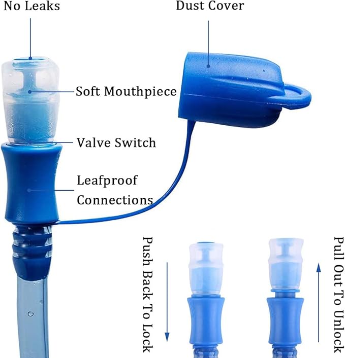 - UPGARDE LEAK PROOF:Soft yet durable mouthpiece with easily accessible ON/OFF valve non-leaking. You can control the water flow by biting, First pull up on the drinking cap, gently bite the mouthpiece with your front teeth to have a sip and start drinking, push back to stop water flow.Quick-release tube is detachable. Auto shut off while the tube is removed, the hydration bladder will stay filled non-leaking. The water storage reservoir also has a dust cover to keep dirt out.