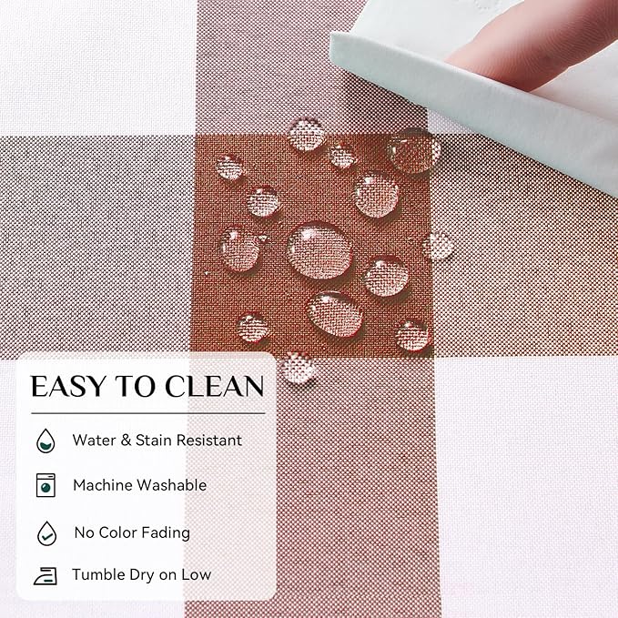 - SPILLPROOF and STAIN RESISTANT: Featuring a fade resistant fabric, the gingham pattern tablecloth is specially treated to be 90% waterproof. Liquids and wine can be easily wiped clean with a damp cloth.
