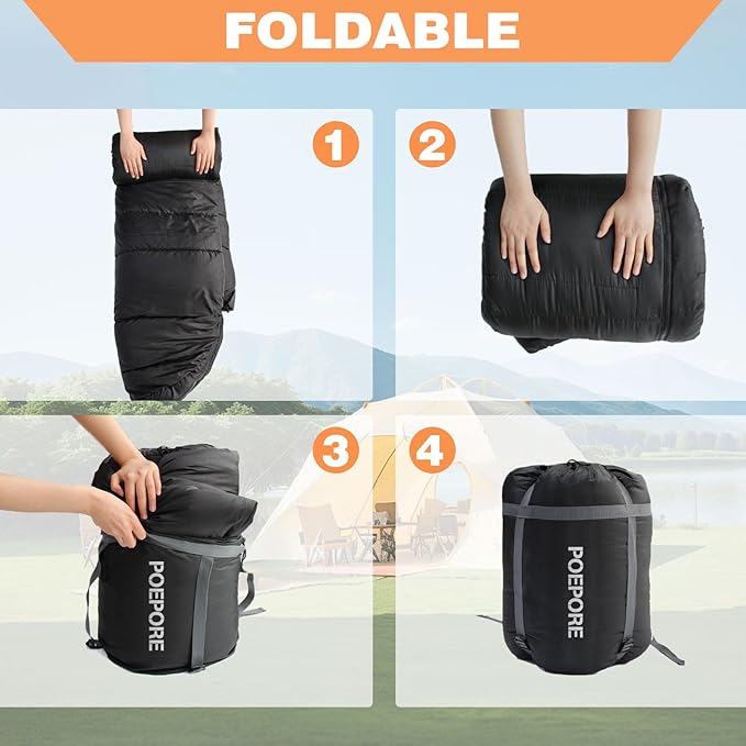 - Convenient Portability: The sleeping bag comes with a convenient storage bag, making it easy to roll up and stow away for transport and storage. These features make the POEPORE sleeping bag an ideal choice for enjoying comfort, warmth, and convenience during outdoor adventures, whether it's camping in the wilderness or relaxing indoors.