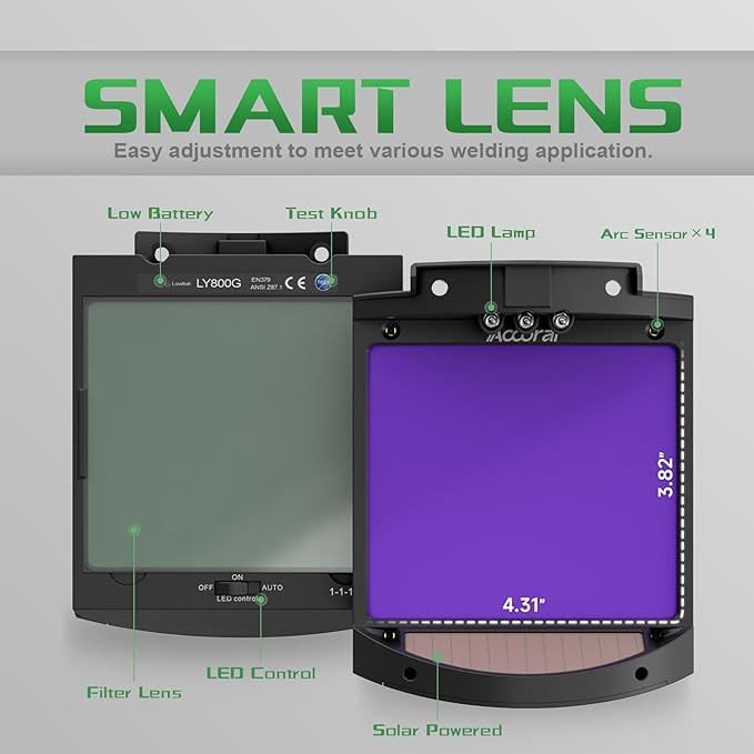 - 【Super Large viewing screen】The 4.31" x 3.82" (16.4 square inch) and side screens (no auto-darkening), combined with exceptional 1/1/1/1 Optical Clarity, guarantees a crystal-clear view, depicting true color views with cinematic quality. Weld with confidence as if you were watching a picture in a movie theater