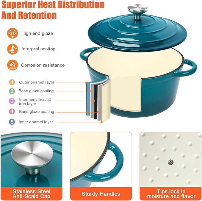 - 🔥【Hard-Coat Enamel 】Our cookware flaunts beautiful enameled interiors and exteriors. The hard-coat enamel resists scratches and chips, tough yet elegant. It supports all cooking styles – sauté, stew, roast, and broil. Oven-safe up to 500℉, you can easily shift from stovetop to oven