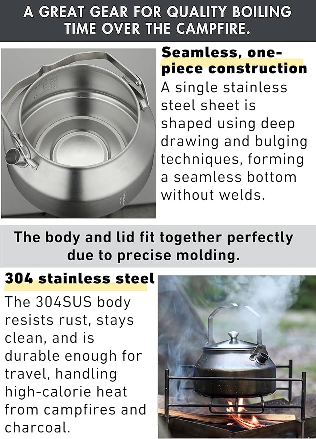 - 【Seamless, one-piece construction】This kettle is crafted from a single stainless steel sheet using deep drawing and bulging techniques, ensuring a weld-free bottom. It combines stunning beauty with durability, capable of withstanding high temperatures from campfires and charcoal.