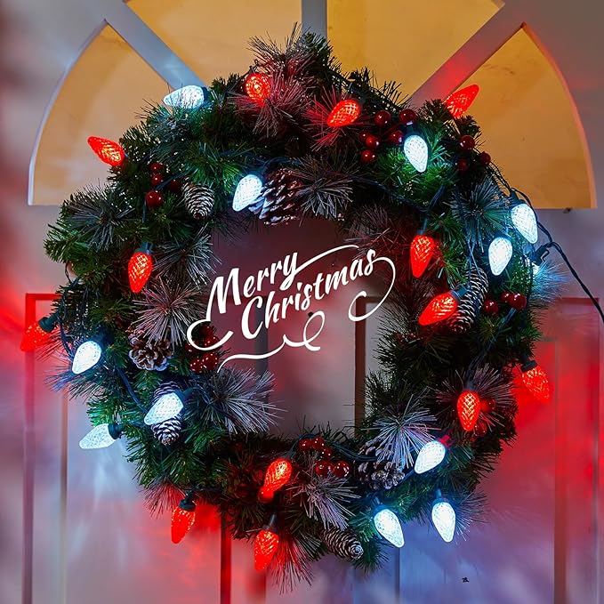 - 【 Brilliantly Bright Glow 】- These Christmas light strings feature large, faceted C9 bulbs made from durable polycarbonate, offering good brightness, colour saturation, ruggedness and reliability. Built-in SMD LED creates vivid lighting effects; the diamond facet hole design prevents stagnant water. Bulbs with vibrant colors will never fade, chip or crack