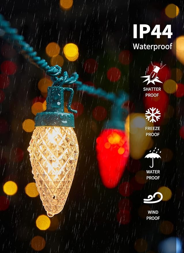 - 【 Brilliantly Bright Glow 】- These Christmas light strings feature large, faceted C9 bulbs made from durable polycarbonate, offering good brightness, colour saturation, ruggedness and reliability. Built-in SMD LED creates vivid lighting effects; the diamond facet hole design prevents stagnant water. Bulbs with vibrant colors will never fade, chip or crack