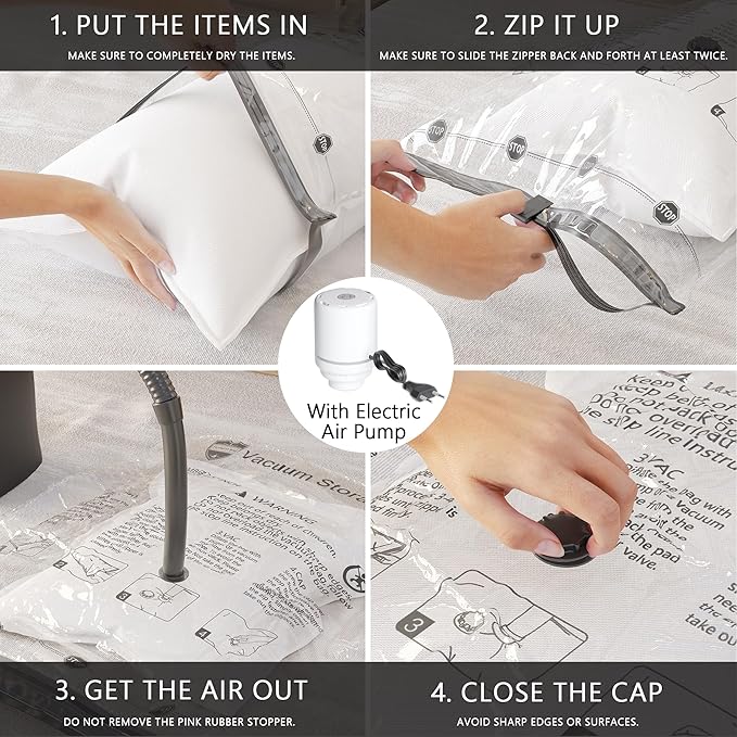 - Convenient Electric Pump: Streamline your packing and storage process with our electric pump, which makes evacuating air from the bags much easier and faster. This tool is a boon for those seeking quick, effective solutions for compression bags for travel and vacuum bags for storage, significantly reducing packing preparation time.
