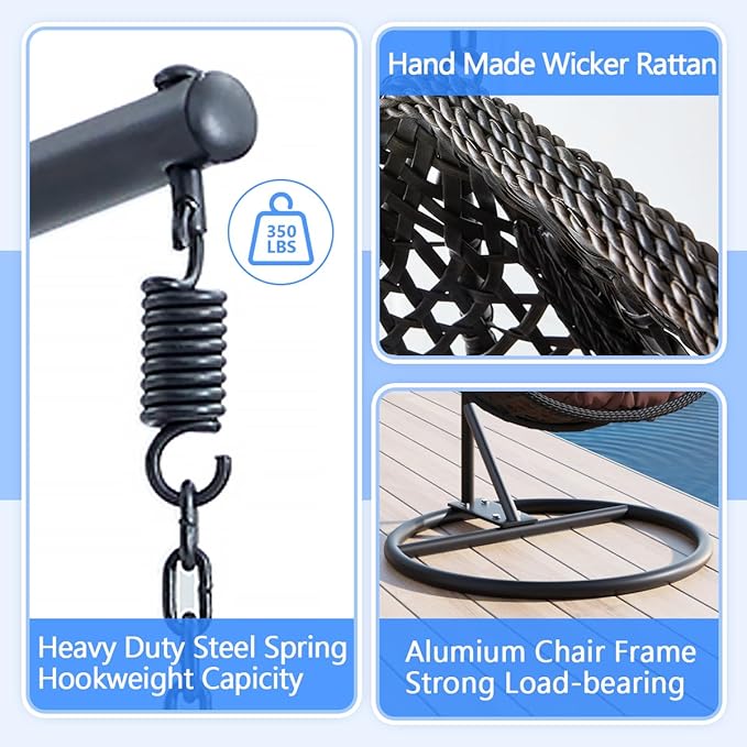 - 【Indoor Outdoor Egg Swing Chair】The egg chairs have an aluminum-steel frame and a strong heavy-duty steel stand. This means the chairs won't get rusty and will last a long time. Also, the stand is very stable and can give steady support on any kind of ground.The swing chair can play a very good decorative role in indoor and outdoor places. It is very simple to move and is very suitable for living rooms, bedrooms, porches, gardens.