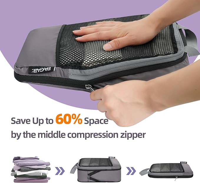 BAGAIL 4 Set/6 Set/8 Set Compression Packing Cubes Travel Accessories Expandable Packing Organizers (Half Mesh, 6-Dark Grey)