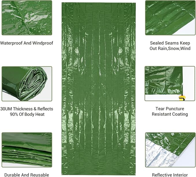 - Sturdy Mylar: The insulating Mylar material is designed by NASA for space exploration. It can reflects 90% of your body heat to keep you warm even under harsh conditions or when your body is weak. It's soft, waterproof, windproof, tear proof and puncture proof. Rain, shine, snow, or something in between- this bivy sack can handle it all.