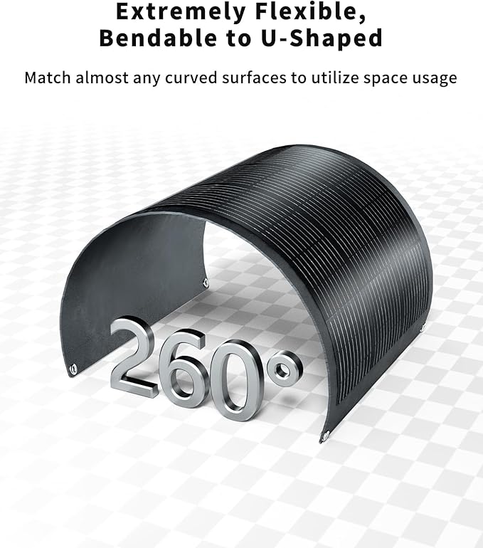 - 【Easy to Install】MC-4 output ports can be transferred to any power station or home solar system. The accompanying 6 straps and curved surfaces allow it to be installed in RVs, roofs, campers, trailers, boats, cabins, sheds, tents, yachts.