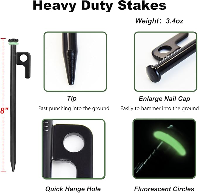 - 【Value Tent Stake Kit】Package come with 32pcs of 8in metal tent stakes(Diameter 3/8", weight 3.7oz), 32pcs fluorescent rubber rings, 1pc storage pouch.
