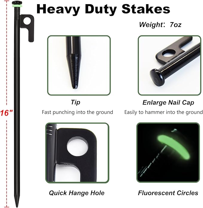 - 【Value Tent Stake Kit】Package come with 10pcs of 16in metal tent stakes(Diameter 3/8", weight 7oz), 10pcs fluorescent rubber rings, 1pc storage pouch.