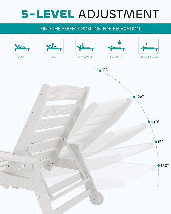 - 5-Position Adjustable Backrest: Our patio lounge chair offers a versatile 5-position adjustable backrest, allowing you to find the perfect angle for ultimate relaxation. Whether you want to read, nap, or soak up the sun, you can easily adjust the backrest to suit your needs.