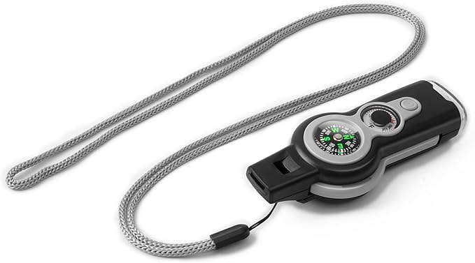 - The 7-in-1 Safety Whistle sets 7 functions including Emergency Whistle, Compass, Thermometer, LED Signal Light, Magnifying Glass, Reflector and Sealed Warehouse with good playability (The uniquely designed miniature built-in storage bin can be used to store important personal information, allowing rescuers to grasp your situation at the first time) (NOTE: If you need help in an emergency, you can try whistling softly, which is louder than whistling at full force)