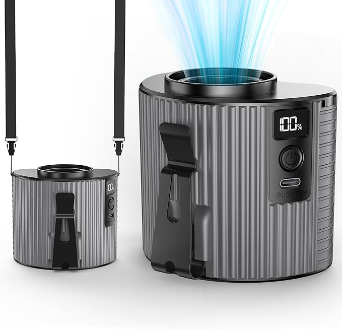 - Multipurpose Design: The waist fan is designed for various outdoor usage scenarios, can be used as a desktop fan or wearable neck fan by using the included manganese steel clip and lanyard. Its portable and lightweight design paired with a soft silicone protective case increases the comfort of work camping travel