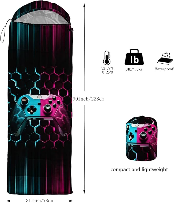 - Applicable For 3 Seasons: Our game console sleeping bag can be used temperatures ranging from 32°F-77°F Except for the cold winter,sleeping bag have weatherproof to prevent from dampness,Size is 31 x 90 inches