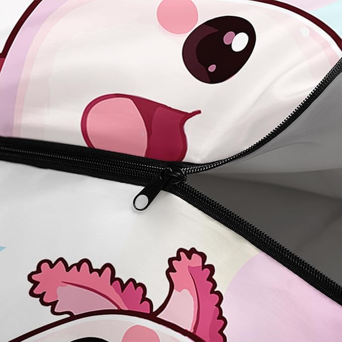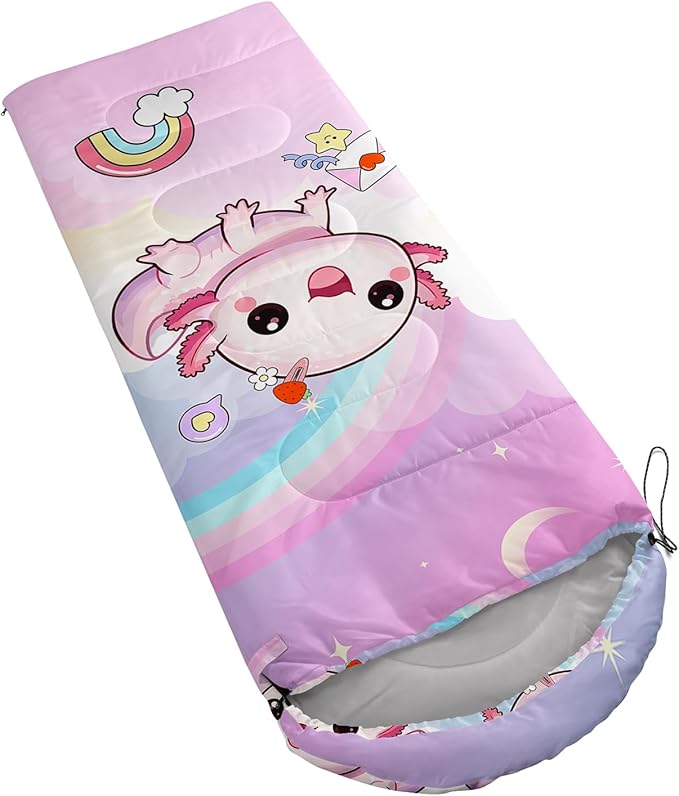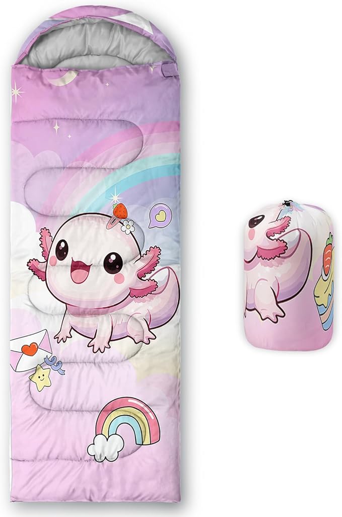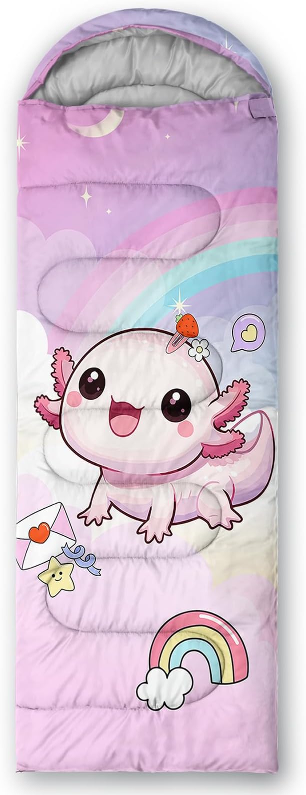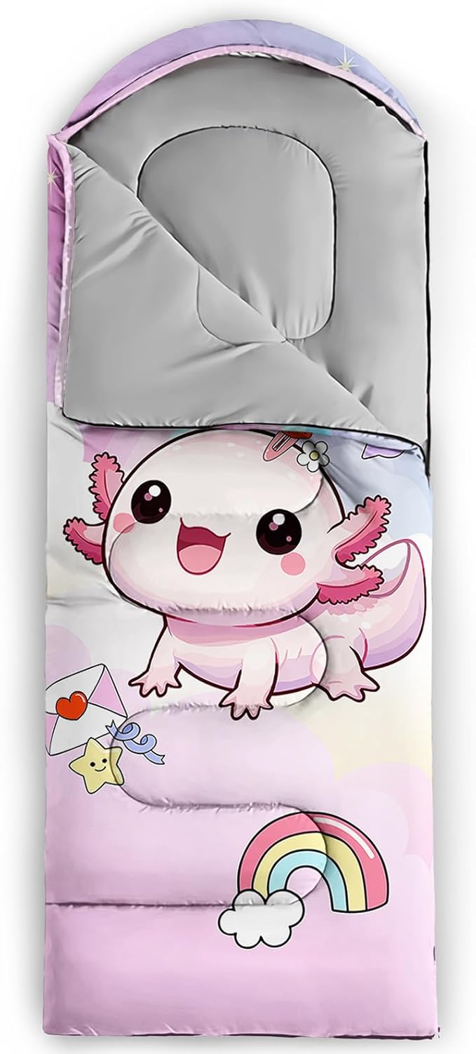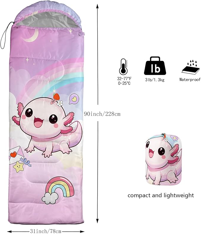 - Applicable For 3 Seasons: Our cute axolotl sleeping bag can be used temperatures ranging from 32°F-77°F Except for the cold winter,sleeping bag have weatherproof to prevent from dampness,Size is 31 x 90 inches