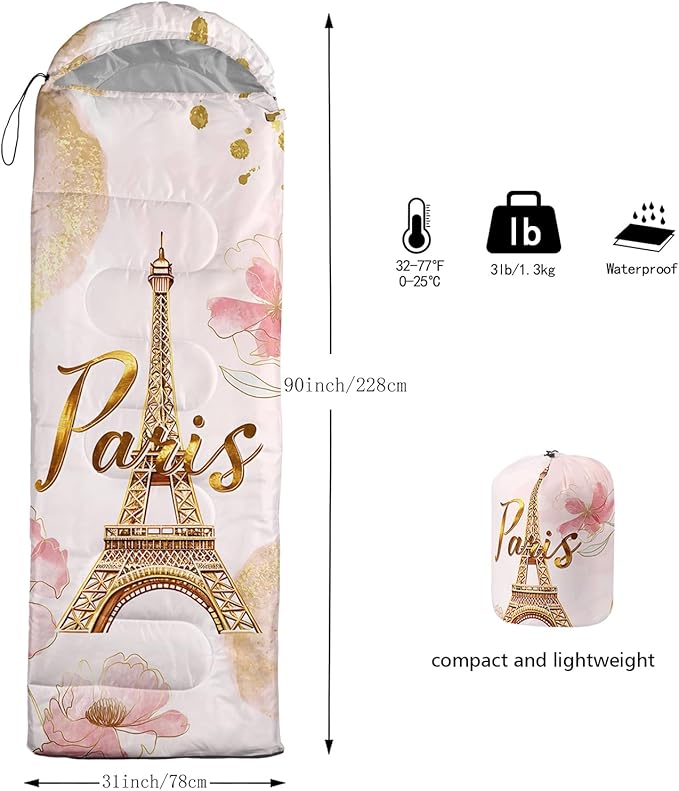 - Applicable For 3 Seasons: Our paris eiffel tower sleeping bag can be used temperatures ranging from 32°F-77°F Except for the cold winter,sleeping bag have weatherproof to prevent from dampness,Size is 31 x 90 inches