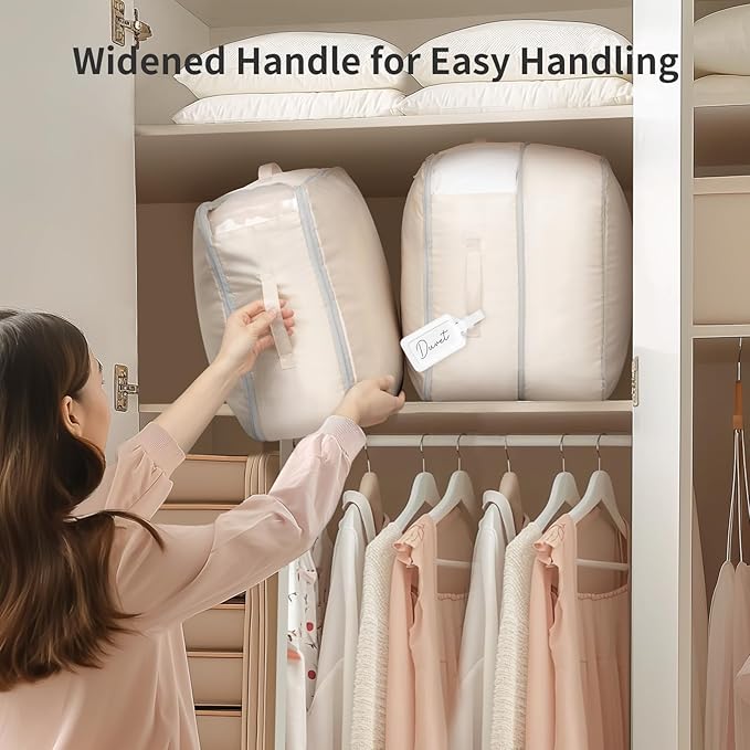 - [Sturdy Dual Handles] Our blanket storage bag features handles on both the side and front, ensuring easy access whether it is placed horizontally or vertically. Reinforced stitching throughout the bedding storage bag ensures it can handle heavy loads, making it an ideal choice for moving, renting, or college dorm living. It fits perfectly in closets, wardrobes, under beds, or suitcases