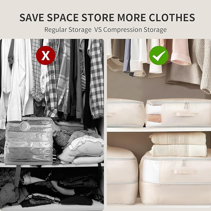 - [Innovative Compression Storage Bags] Our compression organizer effectively retains air during the compression process, safeguarding the fibers and down in your clothing and comforters from damage. This ensures that your items remain fluffy and in pristine condition when you retrieve them the following year. These bags are ideal for safe storage in attics or basements. The dimensions of the compression bags are 11.8 inches (compressed: 5.9 inches) x 16.54 inches x 21.26 inches