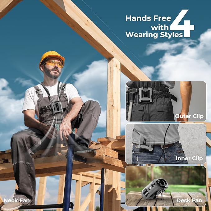 - Ultimate Summer Essential: Wearable fan is compact and lightweight, only 0.64lb, making it easy to carry around and the best companion for outdoor activities such as fishing, hiking, camping, cycling. Ideal for construction, kitchen, farm and warehouse workers