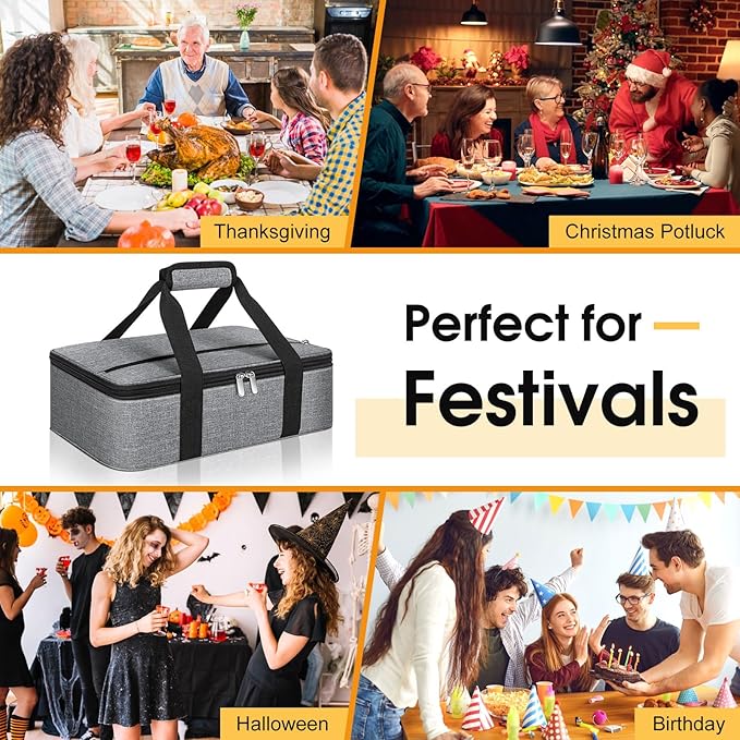 - Details: The casserole dish carrier bag adopt double zipper design, easy to open and close; The internal aluminum film not only holds heat but easy wiped clean with paper towels when encountering dirt; Note: Not machine washable