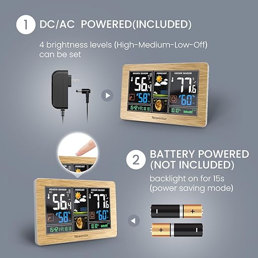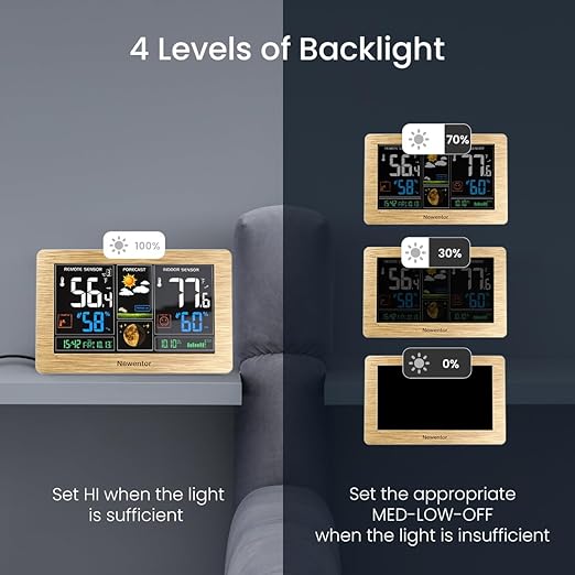 Newentor Weather Station Wireless Indoor Outdoor Thermometer, Color Display Digital Weather Thermometer with Atomic Clock, Barometric Pressure, Forecast Station with Adjustable Backlight, Wood