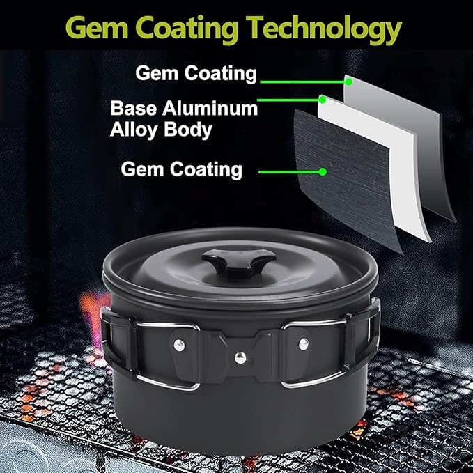 - DURABLE AND SAFE MATERIAL - This camping cookware set is made of food-grade aluminum alloy and includes a camping pot, a camping pan, a bamboo spoon, a cleaning sponge, cutlery, 3 plastic bowls, and a portable nylon set bag. The camping cookware can be nested together, is lightweight, non-toxic, has fast heat conduction, and is wear-resistant and corrosion-resistant.