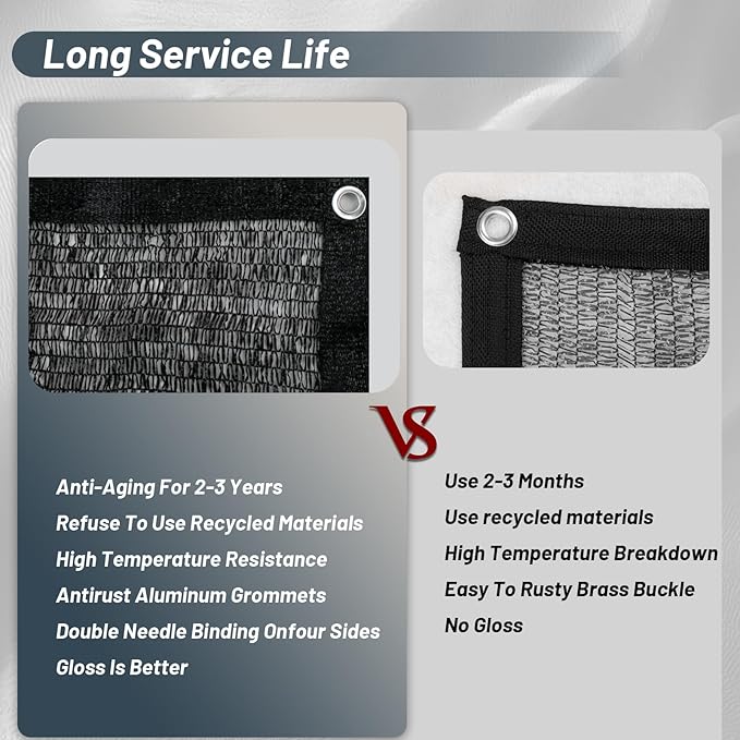 - ??0% Shading Rate?‘Made of 100% New High Density Polyethylene (HDPE) fabric material, has a shading rate up to 70% can avoiding direct sunlight while allowing free air circulation.