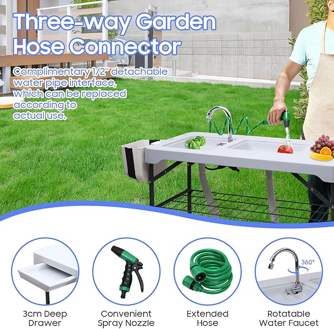 - Dual Functions: This 2-in-1 fish cleaning table features dual sinks and a spray nozzle for efficient food cleaning. It can transform into a picnic table with a removable faucet and covered sinks. Ideal for camping and fishing cleaning, it includes a 360° rotatable faucet and a drainage hole with a plug for easy water discharge.