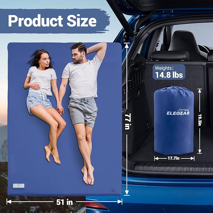 - Newly Upgraded Ultra-thick Camping Pad: Elegear camping mattress pad measures 78" x 51" x 3.1" after inflation, larger and thicker than other camping pads on the market. It can hold up to 800lbs and was tested at a static pressure of 800lbs for 24 hours with no air leakage or damage. Unlike other cheap thin sleeping mats, this 3.1-inch thick foam camping pad will keep you away from the hard ground and won't touch the ground no matter how you flip, offer you a full night's restful sleep.