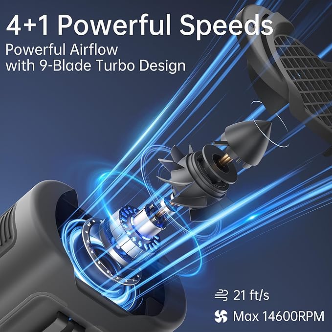 - 【4+1 Powerful Speeds at Your Command】With 4 adjustable wind speeds and 1 independent storm mode button, this jobsite fan is equipped with a high-speed brushless motor that can reach up to 14600RPM, delivering a powerful 21ft/s airflow for instant cooling. Perfect for workers in high-temperature environments who require strong, reliable airflow