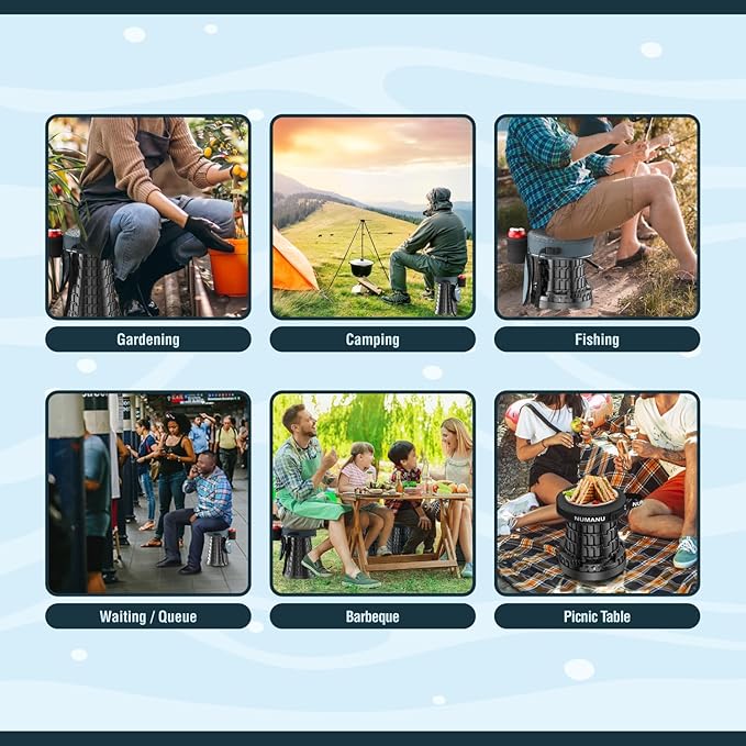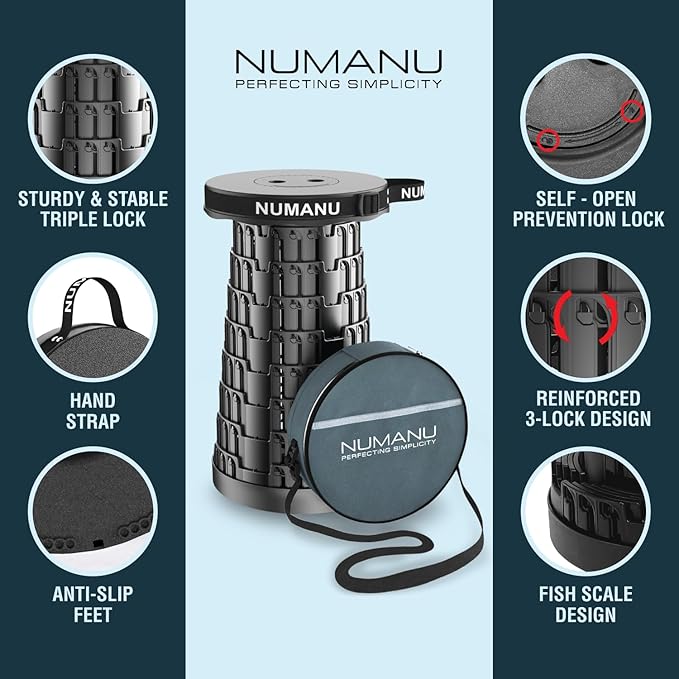 - ๐ฅใENDLESS OPTIONSใThe NUMANU Portable Telescopic Seat, Collapsible Stool is used by many for Camping, Hiking, Waiting in Line, Gift, Live Concert Events, Plumbing, Construction, DIY/Fixing, Fishing, Gardening, Resting, Travel, Commuting, Bus, Train, Subway and More. Take your retractable folding stool along with you!