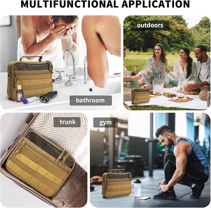 - Convenient Hanging: Our hanging Toiletry Bag Equipped with a comfortable handle and a convenient hook that allows you to easily suspend it from towel racks, coat hooks,bathroom door, or any other convenient spot,convenient for access and saving space. It also has an adjustable string for hanging from door handles or branches. The top handle makes it easy to carry, and the Molle design of the front pocket allows for additional attachments.