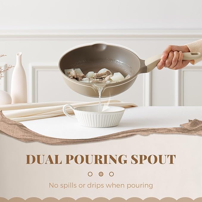 Nonstick Deep Frying Pan with Glass Lid, 12 Inch (4.8 qt), 5X Durable Nonstick Sauté Pan, Scratch & Stain Resistant, PFOA Free, Induction Compatible, Dishwasher & Oven Safe, Natural Linen
