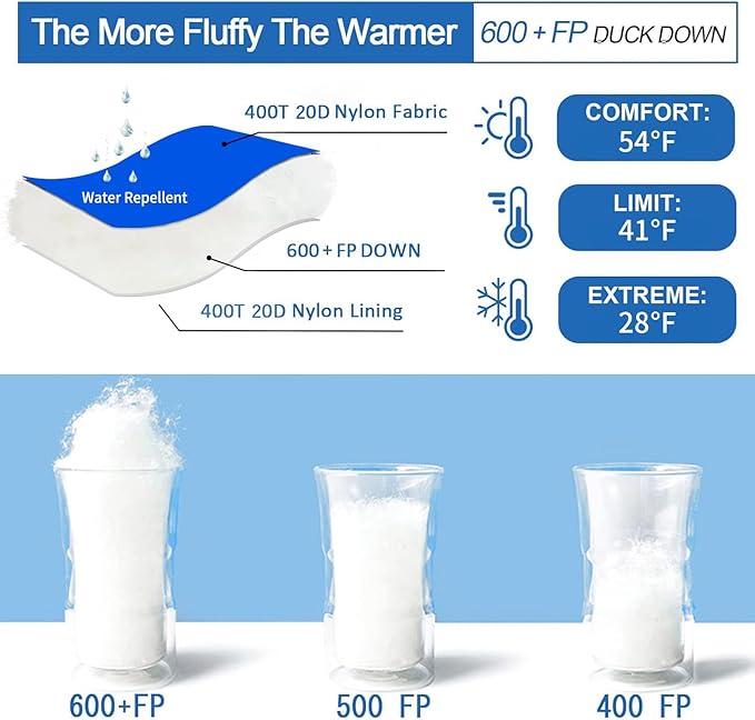 - Keep Warm: Backpacking sleeping bag Filled with 1.1lbs 600 FP premium duck down, comfort temperature 41°F-54°F, limit 28°F. Double zipper design prevents cold air, added chest insulation for better warmth