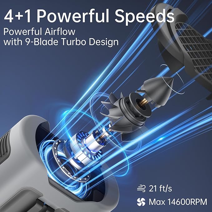 - 【4+1 Powerful Speeds at Your Command】With 4 adjustable wind speeds and 1 independent storm mode button, this jobsite fan is equipped with a high-speed brushless motor that can reach up to 14600RPM, delivering a powerful 21ft/s airflow for instant cooling. Perfect for workers in high-temperature environments who require strong, reliable airflow