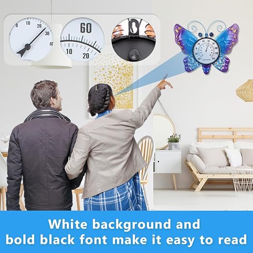 - Easy to Read: The vivid blue butterfly shape and large black dial with large letters make this outdoor thermometer not only clear to read from a distance, but also a cute addition to the wall. Measure about 15 inch in width x 12.4 inch in height