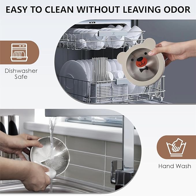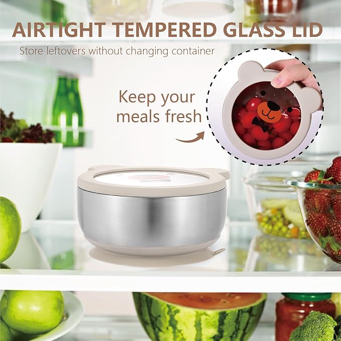 - Adorable Bear Face Lid: Our suction baby bowl comes with a charming bear face lid made from durable tempered glass and soft silicone. This whimsical design not only makes mealtime fun but also helps keep food fresh and protected from contaminants. Your child will love the playful design!