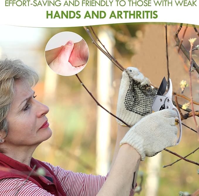 - ๐PRUNING THICK AND THIN BRANCHES IS ALSO EXCELLENT: Our professional garden scissors handheld are great for pruning and general gardening tasks. The ratchet structure and the built-in return spring make us efficient and effortless, making it easy for us to trim, even for arthritis sufferers or those with weak hands