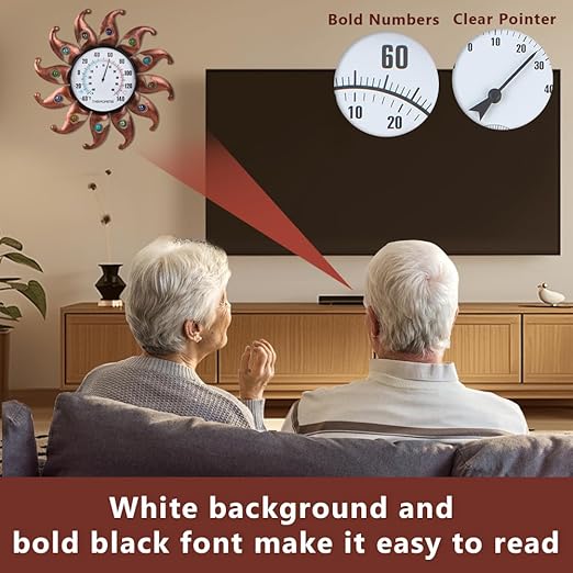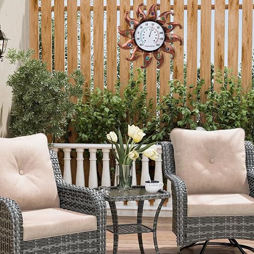 - Easy to Read: The retro copper sun shape with decorative colorful beads and large black dial with large letters make this outdoor thermometer not only clear to read from a distance, but also a vintiage addition to the wall. Measure about 13.5 inch in diameter