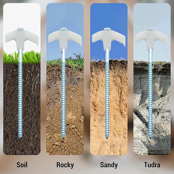 - Widely used: These screw-in ground anchors are suitable for most types of terrain, including sand and soil. Perfect for camping, backpacking, hiking or other outdoor activities. Whether you're looking to secure your tent, awning, pop up, canopy, gazebo or even to secure your dog leash, these heavy-duty stakes would get you covered