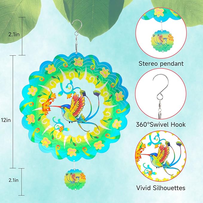 - Exquisite Artistic Design: Inspired by the elegance of hummingbird, our 3D wind spinners features a vibrant and uniquely shaped hummingbird design. Perfect for hanging in your yard, garden, porch, patio, or any indoor/outdoor space you desire. As the gentle breeze passes, the spinning spinner creates a mesmerizing 3D visual effect with changing light patterns, making it a distinctive addition to your garden decor