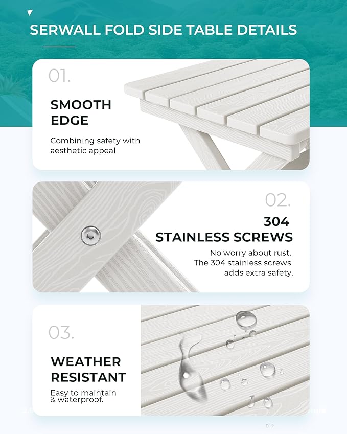 - [Foldable Outdoor Side Table] The SERWALL Adirondack Side Table features a foldable design that significantly reduces its footprint when folded, providing an optimal space-saving solution for outdoor enthusiasts.